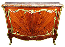 A Very Fine French 19th Century Finely Chased Ormolu-Mounted Regence Style Kingwood, Tulipwood and Satinwood Marquetry and Parquetry Commode with Brêche d' Alep marble-top. The serpentine front with three large drawers with ormolu ring pulls and a centre apron drawer with a floral ormolu decoration, the corners surmounted with acanthus ormolu mounts, raised on four cabriolet legs ending with scrolled sabots. One lock has been removed to reveal the Duvivier/Paris/77 Fb. St. ANTOINE stamp. Circa: Paris, 1880. Ref.: A2207 |
