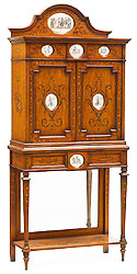 A Very Fine French Napoleon III Figural Ormolu and Porcelain (Probably Sevres) Mounted Tulipwood Meuble A Hauteur D'Appui, by Mathieu Befort, dit Befort Jeune. The rectangular shaped body fitted with a white marble top on with a reticulated frieze of scrolling grapevine and clusters interspersed with doves and centering paired squirrels. The front hinged door trimmed in acanthus cast encadrements enclosing central bleu celeste oval porcelain plaque of a ribbon-tied floral basket within a border of parcel gilt blossoming foliage and framed by cherubic enfants frolicking amongst flowering branches. On each corner, similarly decorated plaques flanked by Bacchanalian corner figures on a serpentine plinth mounted with a lion mask issuing scrolling fruiting foliage centered by square block panels with marguerite detailed mounts. The ormolu stamped "BEFORT". Circa: Paris, 1870. Ref.: A2643 - Lot 11429 |