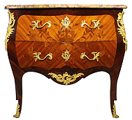 A Fine French 19th/20th Century Louis XV Style Gilt-Bronze Mounted Satinwood and Tulipwood Bois Satiné and Bois de Bout Floral Marquetry Two-Drawer Commode of bombé serpentine form, with a veined Rivera brown/pink marble top above two long drawers on cabriole legs terminating in paw feet, the whole inlaid with foliate sprays in bois de bout marquetry, with gilt-bronze mounts throughout cast with foliage, rocaille and scrolls. Circa: Paris, 1900. Ref.: A2487 |