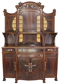 A Fine Italian 19th-20th Century Art Nouveau Carved Walnut Buffet Server by Vittorio Valabrega (1861-1952). The Finely carved walnut body with twin center doors carved with grape vines, fitted with molded yellow-craft-glass panels above an apron drawer, flanked by single doors with equal carvings, all with silver-plated hardware in the form of scrolled branches with leaves, fitted with a veined Rivera brown marble top. Circa: Turin, Italy 1900. Ref.: A2404 - Lot 9349 |