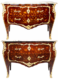 A Fine Pair of French 19th-20th Century Louis XV Style Gilt Bronze-Mounted (Ormolu) Tulipwood, Kingwood and Satinwood Floral Marquetry Bombé His and Her's Commodes with Marble Top. The serpentine two-drawer commodes with bowed front and sides, surmounted with floral and shell gilt bronze mounts, the front corners with acanthus gilt bronze mound and the two front cabriolet legs with gilt bronze figural sabots. Circa: Paris, 1900. Ref.: A2458 - Lot 11300 |