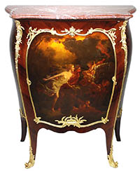 A Fine French 19th Century Louis XV Style Kingwood and Tulpwood Gilt-Bronze Mounted Vernis Martin Style Serpentine Meuble d'Appui (Side cabinet) with Marble Top. The triple-bombé single door body fitted with a Spanish Brocatelle marble top, the single front door centered with a painting depicting a park scene with a man seated across two ladies and a young man standing between them playing violin, the upper apron painting section depicting a lake scene with coastal trees, all surmounted with floral and acanthus ormolu mounts and raise on cabriolet legs with gilt-bronze sabots. Two interior wooden shelves. The lockplate stamped: "V.F. (Crossed keys) Paris" for Vachette Frères. Founded in 1864 in Troyes as Bresson-Vachette - in 1865 became Vachette Frères, one of the leading French locksmiths of the second half of the 19th century. Circa: Paris, 1880. Ref.: A2698 |