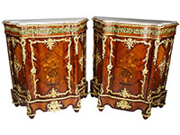 A Fine Pair of French 19th-Century Louis XV-style Marquetry and Gilt-Bronze Mounted Meuble d'Appui Side-Cabinets with marble tops. Each single-door satinwood veneer side cabinet is centered with a marquetry design featuring a vase with a floral arrangement, surmounted by ornate floral and acanthus ormolu mounts. The cabinets include a pierced floral ormolu apron and an allegorical gilt-bronze mount at the bottom, depicting a pair of cherubs holding a flame and a sand-glass next to a bird; fitted with a later light-beige marble tops. (Refinished). Circa 1870-1880. Ref.: A2805 - Lot 11386 |