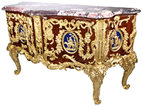 A Fine and Impressive French 19th Century Louis XV Style Ormolu-Mounted Mahogany and Parquetry Commode a Vantaux, after the model Antoine Gaudreaux's 'Commode Médallier du Roi Louis XV'. The ornate ormolu mounted serpentine body with a moulded shaped marble top above a pair of doors opening to four drawers, the front applied within a foliate and ribbon-tied acanthus leaves and flower garlands, the medals cast with Roman Emperors and centered by ovals with a cherub and goat and Ariadne on a leopard on a Royal Bleu background, all on a diamond parquetry ground centered by a female mask, the shaped sides with similar mouldings, centered by Hercules and Venus with Athena on moulded scroll legs, each headed with ram's head mounts. Circa: Paris, 1880. Ref.: A2807 |