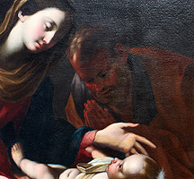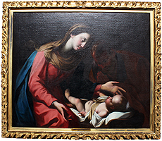 A Very Fine Italian 18th Century Oil on Canvas "Madonna and Child" after Giovanni Lanfranco (Italian, 1582-1647). The young Virgin Mary attending to a joyful baby Jesus laying down in front of her with an elder man praying to the side, all within an ornate gilt wood carved frame. Circa: 1780.
