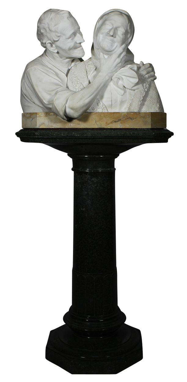 FERDINANDO VICHI (Italian (1875-1945) A Very Finely Carved Italian 19th-20th Century White Carrara Marble Romantic Style Life-Size Bust Group Titled "Rimembranze" (Remembrance) depicting a charming embracing elderly couple, the man tenderly touching the lady's chin and face, both with a loving and mesmerized look on their faces. Vichi's talented depiction and fine detailed carving of the couple's wrinkles, veins, muscles, clothing and expressions make this sculpture one of his finest and most detailed works. On a Yellow Sienna marble plinth and raised on it's original swiveling Verde-Green Alps marble pedestal. Signed: F. Vichi, Florence ~ Made in Italy. Circa: Florence, 1900.