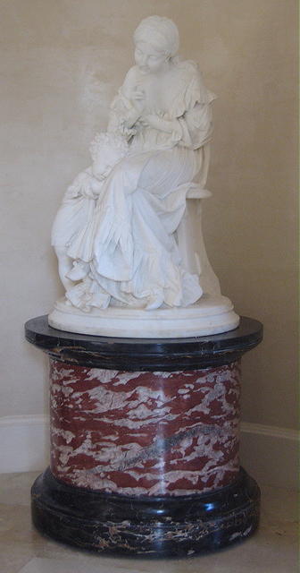 The other sculpture, "Mother and Son", also by Borghi, depict a young mother sitting on his baby's weaved rocking crib, while playfully holding him as he kisses her on the cheek. Each sculpture is raised on their original matching pair of two-tone veined French Alps Noir Maurin and Griotte Uni marble pedestal stands. Signed and dated, A. Borghi, 1876. |