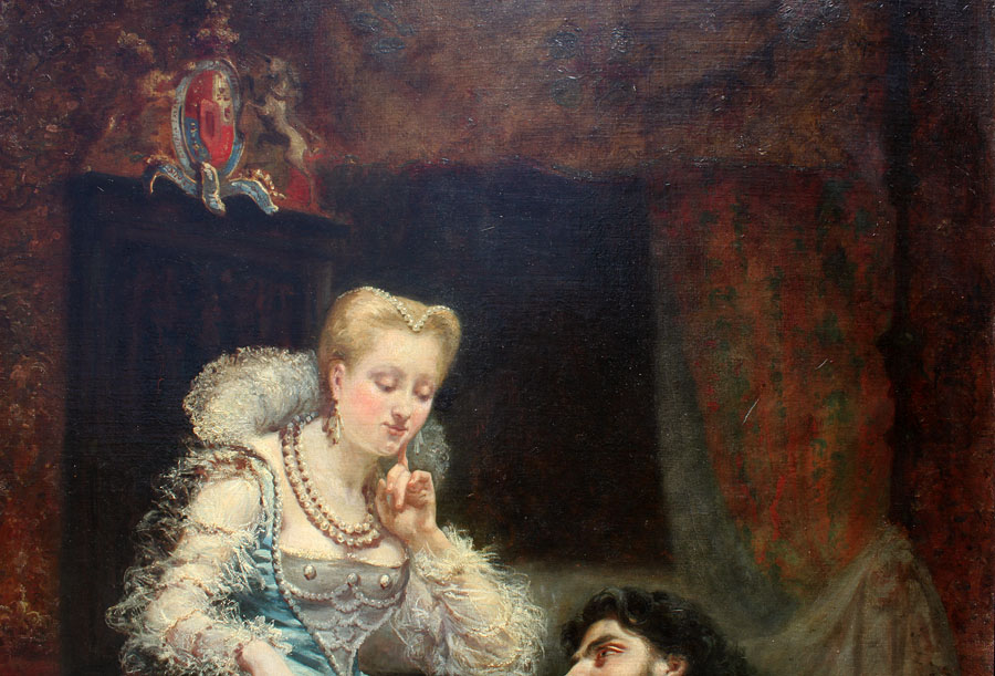 Théodore Lemonnier (French, 1815-1888) A Fine and Large Oil on Canvas Laid on Masonite, titled "Le Sérénade" within an ornate gildwood carved frame. The elongated painting depicting an interior seated Princess being serenated by a young troubadour, seated on a pillow by her footstep playing the bandolin, his baret and sword resting on the floor next to an urn with an upsidedown goblet. Signed on the lower right corner: Lemonnier Théodore. Circa: 1870.