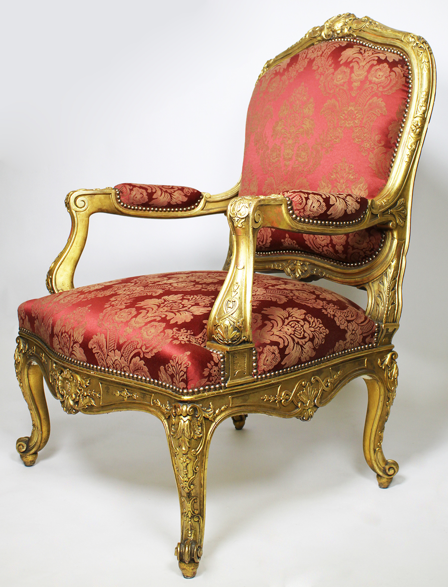 A Fine French 19th Century Louis XV Style Gilt Wood Carved Three Piece Salon Suite, comprising of a canapé (Settee) and two fauteuils à la reine (Armchairs), all recently re-upholstered and with original gilt. Circa: Paris, 1890.