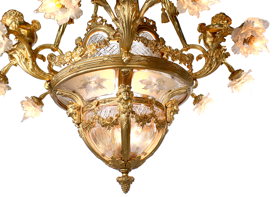 A Very Fine and Palatial French 19th-20th Century Louis XV Style Gilt-Bronze (Ormolu) and Fitted-Baccarat crystal (cut-glass) Twenty-Six-Light Figural Chandelier with Five Large Cherubs, each holding a frosted glass torch and surmounted with two arm-lights, each with their original frosted glass shades, the five extending supports in the form of drapes with tassels and the bottom plafonnier with fitted cut-glass edged panels in the form of an upside-down dome. Stamped: Baccarat, France and other stamps with letters and numbers on gilt-bronze frame. Circa: Paris, 1900.