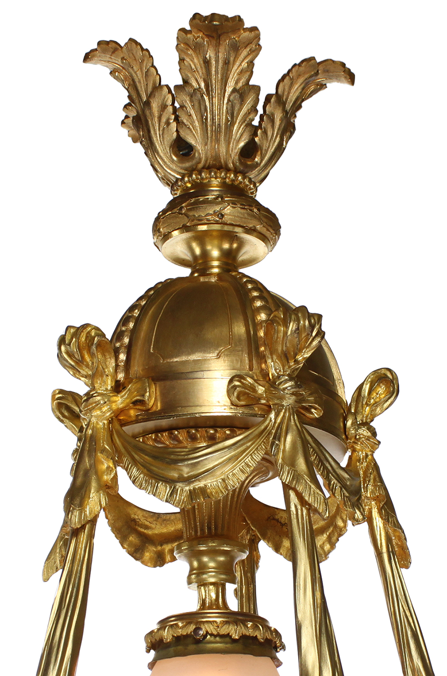 A Very Fine and Palatial French 19th-20th Century Louis XV Style Gilt-Bronze (Ormolu) and Fitted-Baccarat crystal (cut-glass) Twenty-Six-Light Figural Chandelier with Five Large Cherubs, each holding a frosted glass torch and surmounted with two arm-lights, each with their original frosted glass shades, the five extending supports in the form of drapes with tassels and the bottom plafonnier with fitted cut-glass edged panels in the form of an upside-down dome. Stamped: Baccarat, France and other stamps with letters and numbers on gilt-bronze frame. Circa: Paris, 1900.