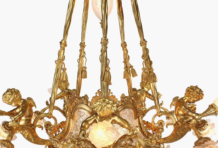 A Very Fine and Palatial French 19th-20th Century Louis XV Style Gilt-Bronze (Ormolu) and Fitted-Baccarat crystal (cut-glass) Twenty-Six-Light Figural Chandelier with Five Large Cherubs, each holding a frosted glass torch and surmounted with two arm-lights, each with their original frosted glass shades, the five extending supports in the form of drapes with tassels and the bottom plafonnier with fitted cut-glass edged panels in the form of an upside-down dome. Stamped: Baccarat, France and other stamps with letters and numbers on gilt-bronze frame. Circa: Paris, 1900.