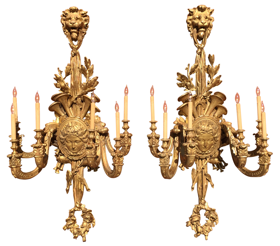 An Important and Palatial Pair of French 19th Century Louis XV Style Gilt-Wood Carved Six Light Wall Appliques (Sconces), the six scrolled candle-arms emanating from a center medallion with a female mask and surmounted with musical instruments, acanthus and leaves, the top with a carved lion head holding a draped swagged tassel supporting the entire fixture. Circa: Paris, 1870.