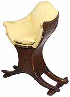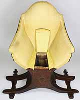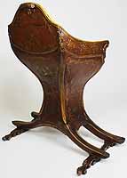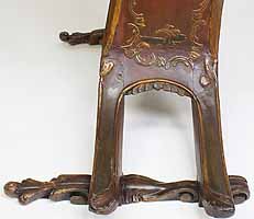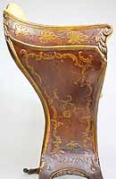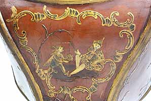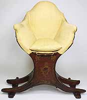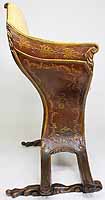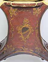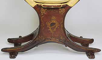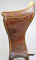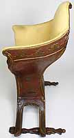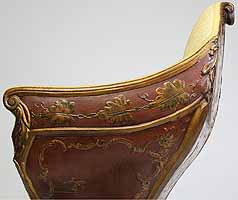 A Fine and Rare Venetian 18th-19th Century Chinoiserie Decorated Red-Lacquer and Parcel-Gilt Gondola (Gondolieri) Chair. The curved sides centered with a pillow seat and padded back and sides, decorated with a parcel-gilt and ink crest, probably the Gondolieri's family Crest, scrolls and acanthus with floral, leaves, birds and tree decorations and an allegorical painting of two Chinese male figures, resting on twin bracket feet supports. The seat with a storage compartment under a lifting door. Circa: Venice, 1800.