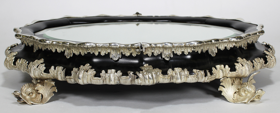 A Very Fine French 19th/20th Century Ebonized Wood and Figural Silver Plated Mounted Plateau Centerpiece in the manner of Buccellati . The ovoid shaped body surmounted with silvered bronze mount figures of dolphins, algae trim and centered with an engraved monogrammed shield, the top with a fitted beveled mirror. Circa: Paris, 1900.