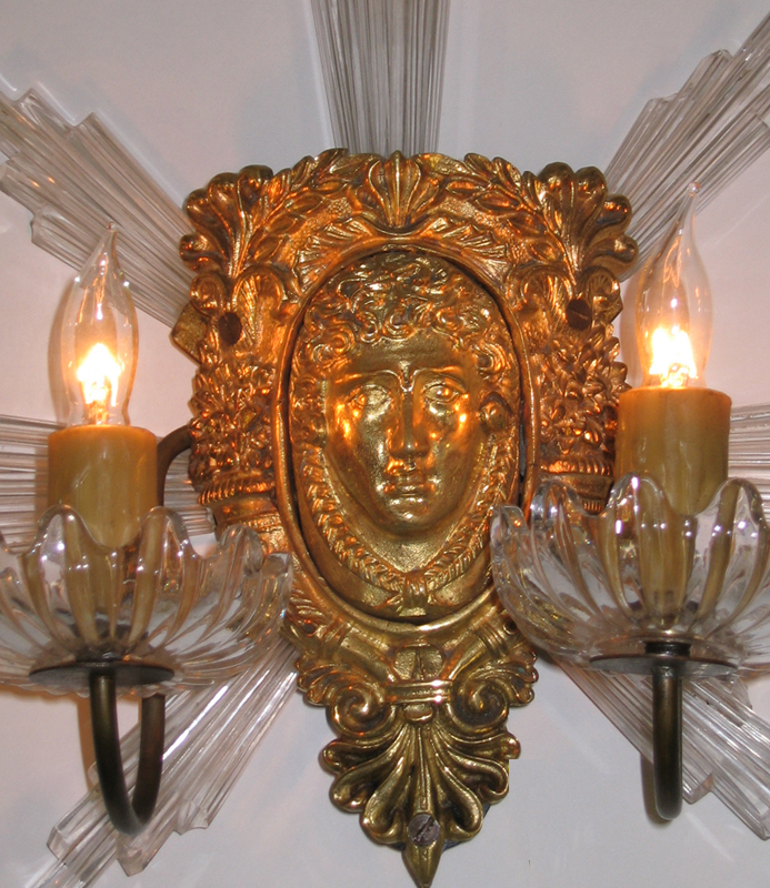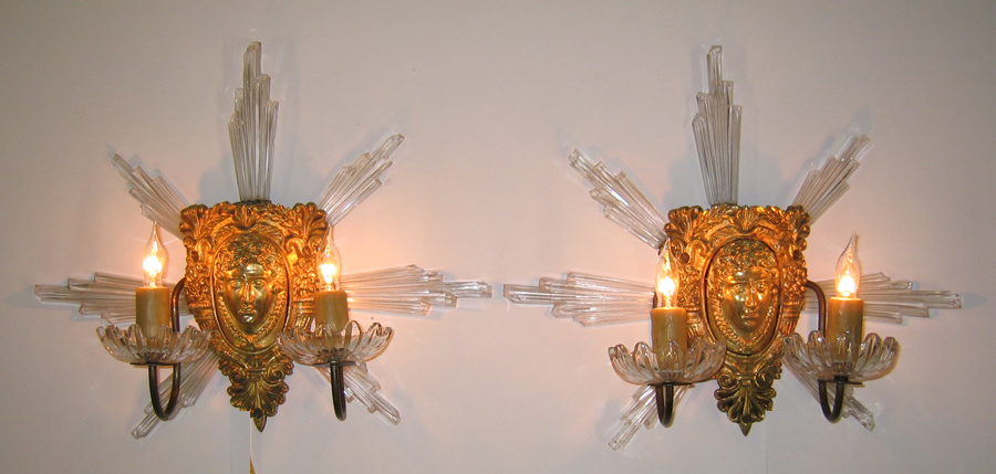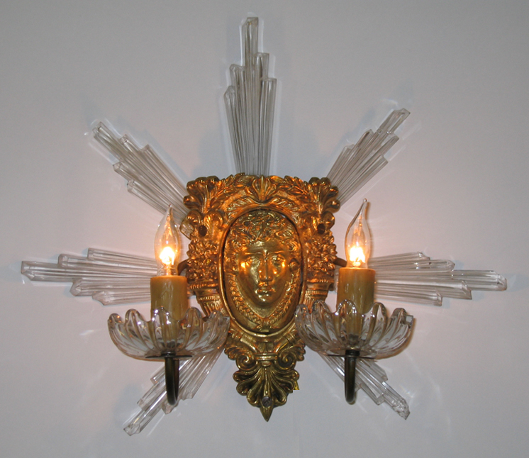 A Very Fine Pair of French Belle Époque Gilt-Bronze and Cut-Glass Two-Light Figural Wall Sconces each in the form of a sun burst centered by a female mask. Circa: Paris, 1900.
