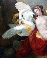 A Fine and Large Italian 19th Century Old Master School Oil on Cavas Titled "Leda and The Swan" within a gilt wood frame. Leda and the Swan is a motif from Greek mythology, in which Zeus came to Leda in the form of a swan. According to later Greek mythology, Leda bore Helen and Polydeuces, children of Zeus while at the same time bearing Castor and Clytemnestra, children of her husband Tyndareus, the King of Sparta. As the story goes, Zeus took the form of a swan and seduced Leda on the same night she slept with her husband, King Tyndareus. Thanks to the literary renditions of Ovid and Fulgentius it was a well-known myth through the Middle Ages, but emerged more prominently as a classicizing theme, with erotic overtones, in the Italian Renaissance. Since ancient Roman times, there have been several depictions of Leda and The Swan, including works by Renown artists like Leonardo da Vinci, Michelangelo, Correggio, Cesare da Sesto, François Boucher, Jean-Léon Gérôme, Paul Cézanne, Cy Twombly and many others. Unsigned. Circa: Florence, Italy 1870-1880.