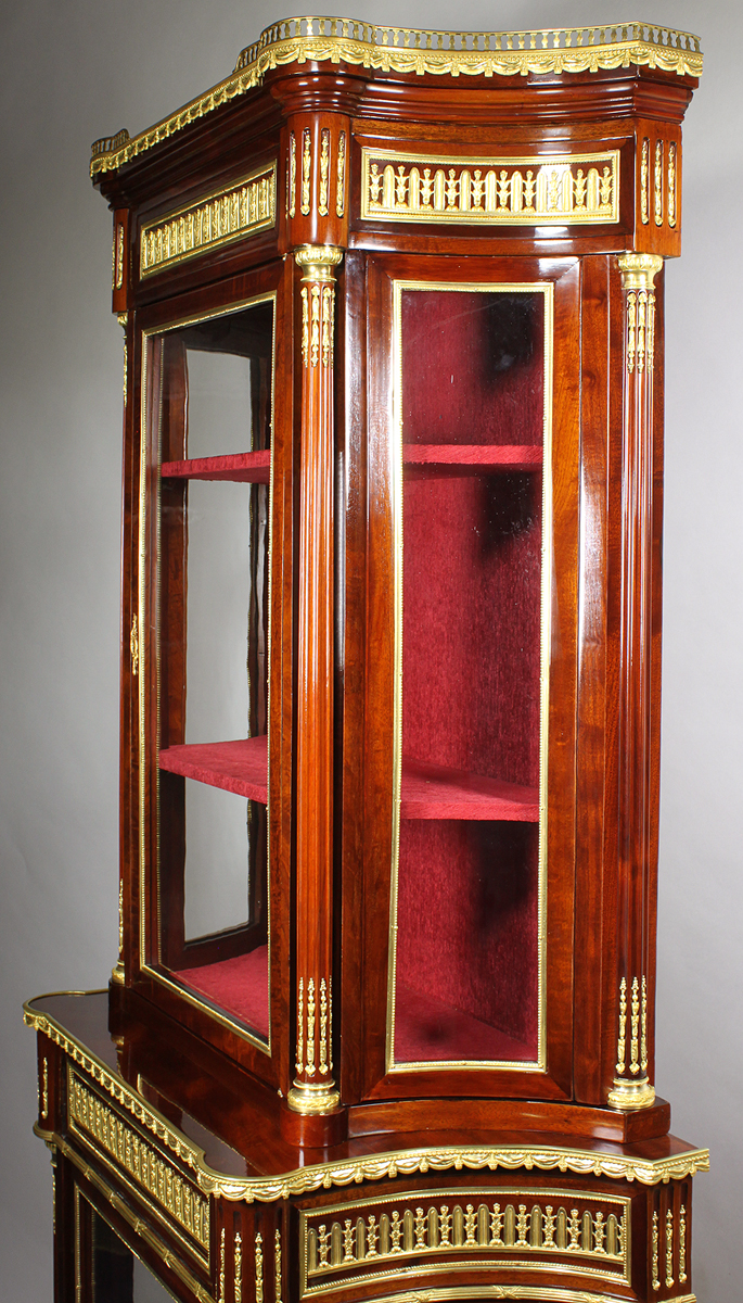 A Fine French 19th Century Louis XVI Style Mahogany and Ormolu Mounted Two-Tier Vitrine Cabinet. The upper section with a single glass front door below a pierced gilt-bronze floral railing and bowed glass side panels, the top with a draped gallery and fluted columns with gilt-bronze floral inserts. The lower section with a single apron drawer also surmounted with a pierced gilt-bronze floral railing above a single glass door surmounted with fluted columns with gilt-bronze floral inserts, the sides with bowed glass panels, all raised on four cone-shaped legs with gilt-bronze rings and sabots. Attributed to Théodore Millet. Circa: Paris, 1890-1900.