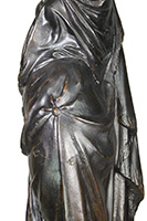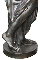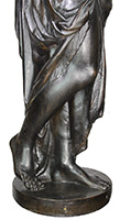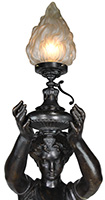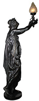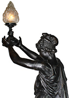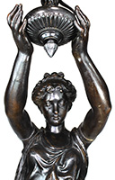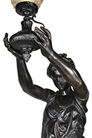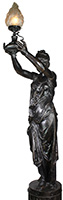 A Very Fine Pair of French 19th/20th Century Neoclassical Style Patinated Cast Iron Figural Torchères by Antoine Durenne, Paris, each representing a figure of a standing young maiden, her arms raised forward while holding a a flaming urn gas light (Now electrified) with a frosted glass flame, each raised on a veined grey marble column stand. Both cast-signed 'A. Durenne, Paris'. Antoine Durenne was an internationally renowned French art founder. He attended École Nationale Supérieure des Beaux-Arts in 1842. Durenne purchased a small foundry in Sommevoire, near the Val d'Osne, Haute-Marne, France and established The Durenne firm. Circa Paris, 1900.