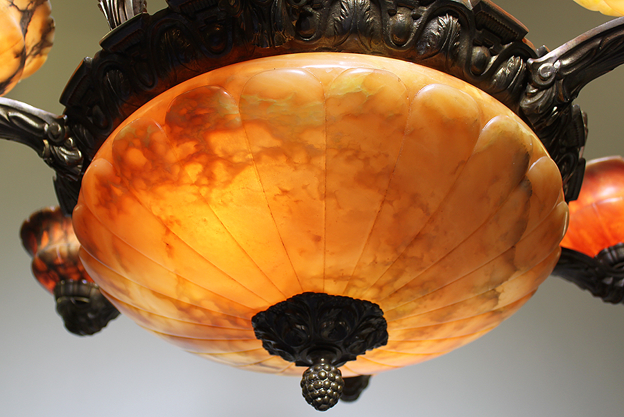 A French 20th Century Art Deco and Bronze Carved Veined Caramel-Colored Alabaster Six-Light Chandelier. The carved circular alabaster plafonnier with a floral apron and banded frame with six alabaster lights supported by cornucopia shaped bronze cups. Circa: Paris, 1920-30.