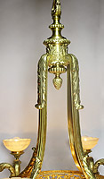 A Fine and Large French Art Deco Gilt-Bronze and Veined Alabaster Eight-Light Figural Chandelier. The pierced floral circular frame surmounted with a large carved alabaster plafonnier supported with a bronze acorn finial, with a set of four twin-light candle-arms with alabaster shades, each arm centered with a mask figure of Bacchus, all supported with four curved supports ending with an acorn fininal. Circa: Paris, 1900.