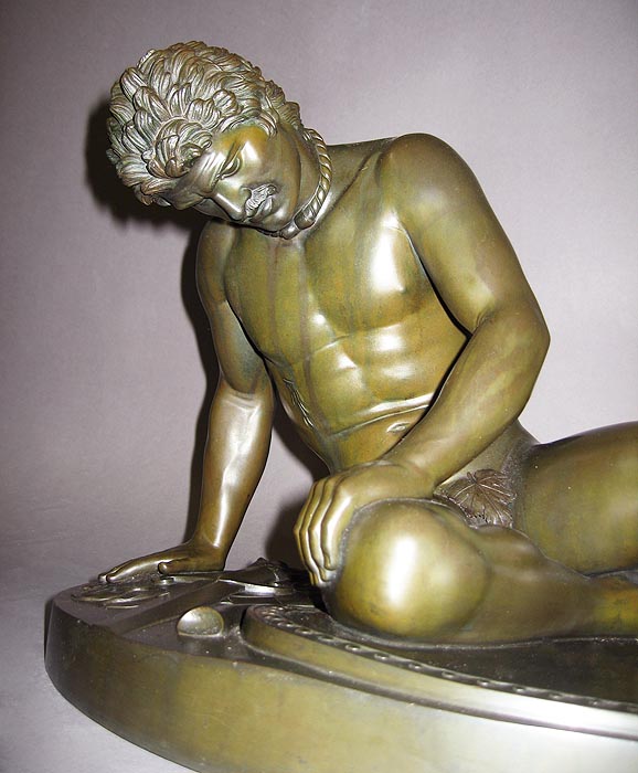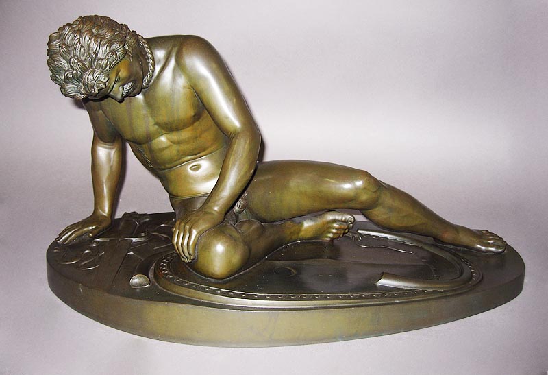 A Fine Quality French 19th/20th Century Dark-Green Patinated Bronze Figure of "The Wounded Gaul" (Also known as The Dying Gaul) a copy of the well known orginal Greek work circa 270 B.C. now exhibited at the Capitoline Museum in Rome. The Galatians/Galli/Gauls were in their origin a part of the great Celtic migration. The Celts who settled in Galatia came through Thrace under the leadership of Leotarios and Leonnorios Circa: Paris, 1900.