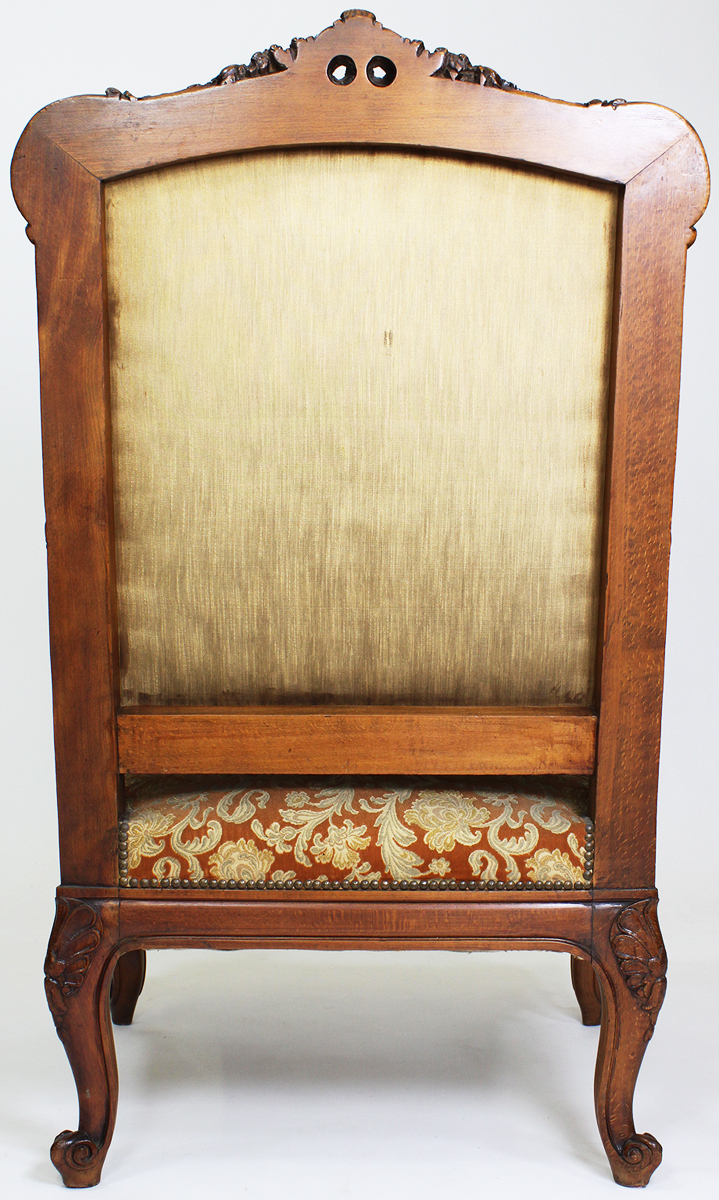 A Fine and Large French 19th Century Louis XV Style Carved Walnut Three-Piece Salon Suite. The high back intricately carved frames with floral and wreath design, comprising of a three-corps settee and two armchairs, all with open and padded armrests and raised on cabriolet legs. Circa: Paris, 1890