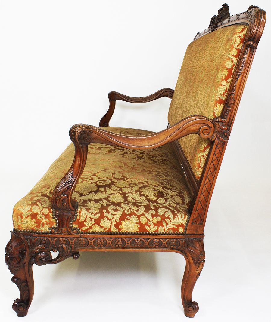 A Fine and Large French 19th Century Louis XV Style Carved Walnut Three-Piece Salon Suite. The high back intricately carved frames with floral and wreath design, comprising of a three-corps settee and two armchairs, all with open and padded armrests and raised on cabriolet legs. Circa: Paris, 1890