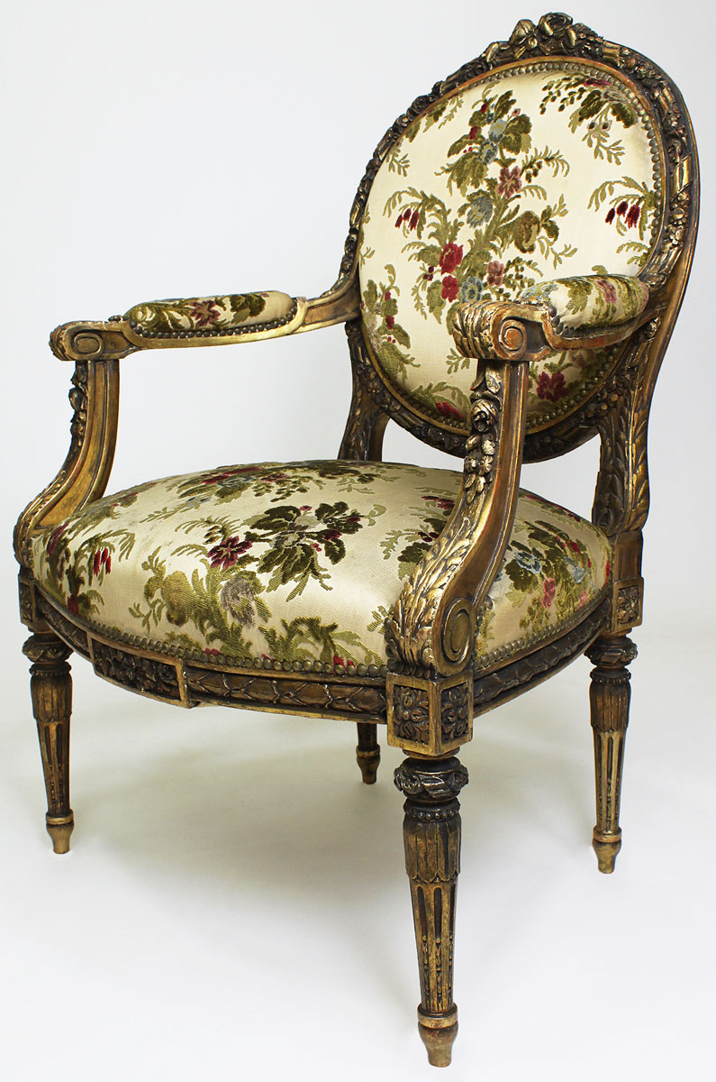 A French 19th/20th Century Louis XVI Style Gilt Wood Carved Three-Piece Salon Suite Frames. The ornately carved set comprising of a settee and a pair of fauteuils a la Reine (armchairs). The settee with floral carvings and rounded bergère style upholstered sides, the armchairs with open and padded armrests and round backrests, all raised on tapered fluted legs. Circa: Paris, 1900.