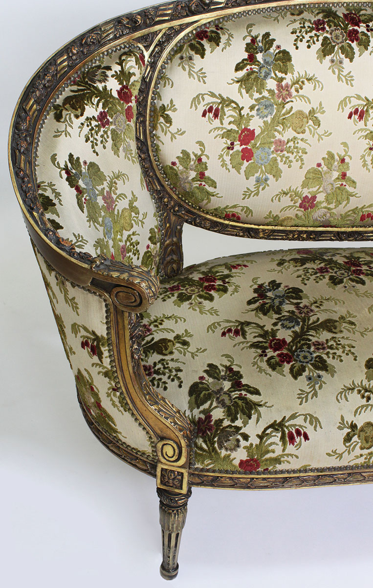 A French 19th/20th Century Louis XVI Style Gilt Wood Carved Three-Piece Salon Suite Frames. The ornately carved set comprising of a settee and a pair of fauteuils a la Reine (armchairs). The settee with floral carvings and rounded bergère style upholstered sides, the armchairs with open and padded armrests and round backrests, all raised on tapered fluted legs. Circa: Paris, 1900.