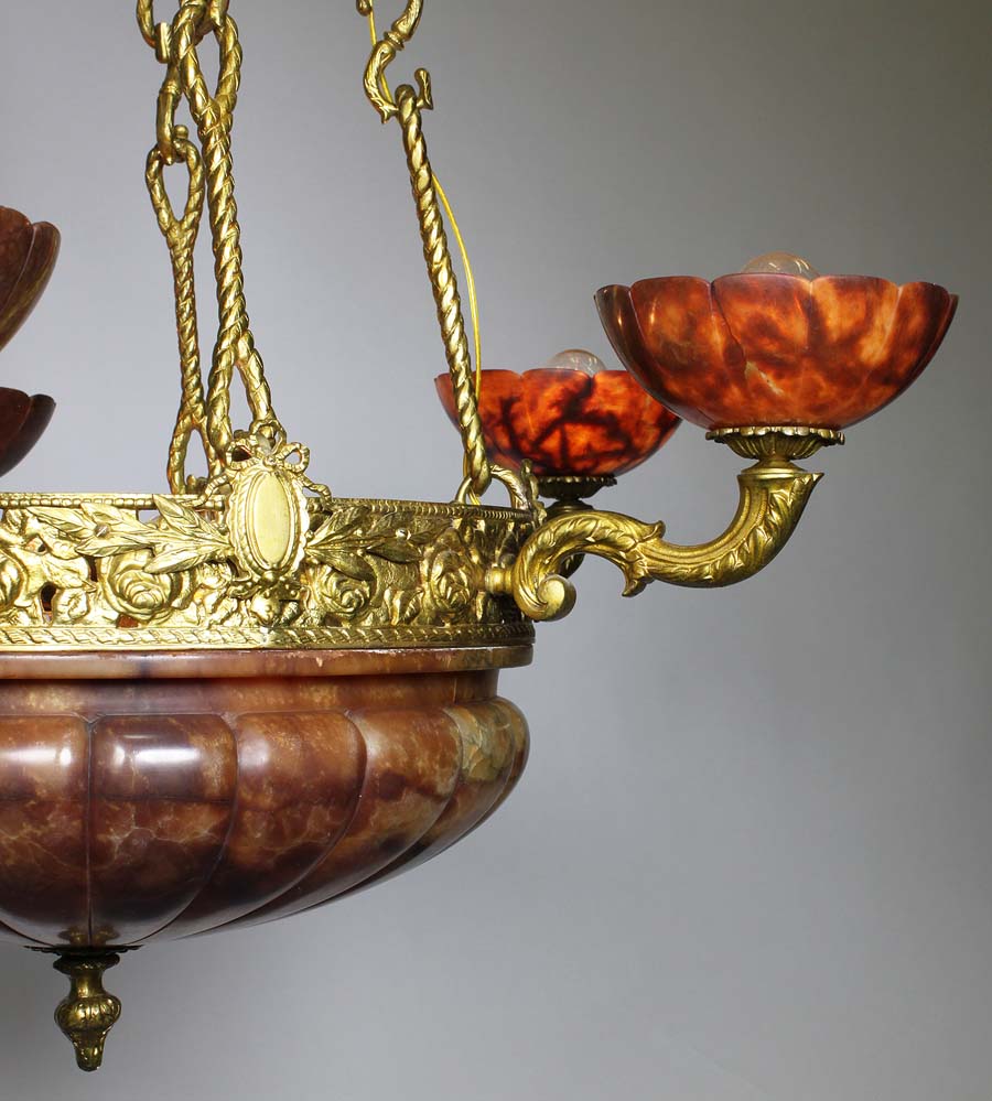 A French Early 20th Century Art Deco Bronze and Carved Rubi-Color Alabaster Five-Light Chandelier. The pierced bronze frame, suspended by five rope-like bronze supports and surmounted with five scrolled shaped lights, all fitted with carved alabaster shades, the centre supporting a large carved alabaster plafonnier with two interior lights and an acorn shaped finial. Circa: Paris, 1920.