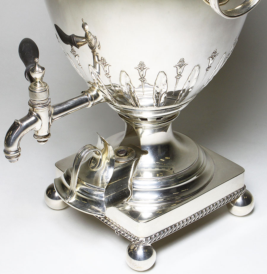 A Fine and Large Pair of English 19th Century George III Style Plated Hot Water-Tea Samovars by Elkington & Co. London, each urn-form finely chased with a floral design reservoir with side ring-shaped handles, surmounted by a domed cover and raised on square base and ball feet with pull-out burners. Stamped: "Elkington Plate" with hallmarks. Circa: London, 1880.