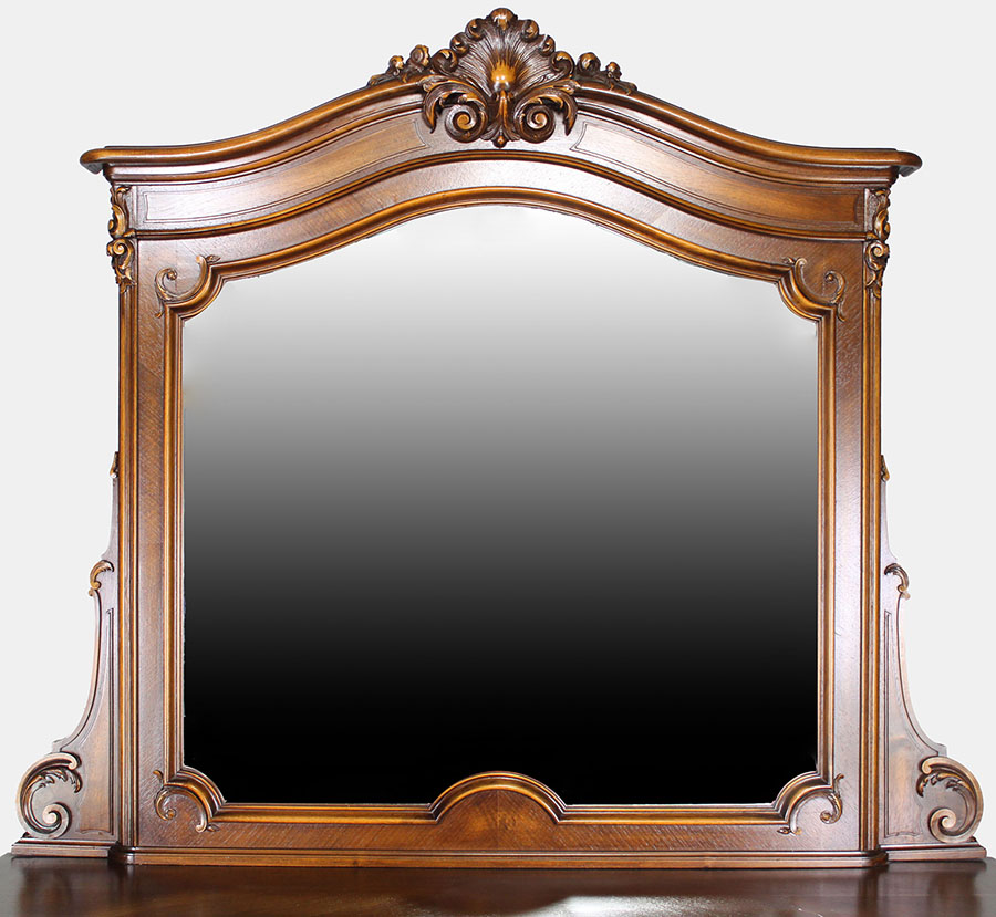A Country French 19th/20th Century Louis XV Provençal Style Carved Walnut Vanity Dressing Table with Drawers. The large commode cabinet with six upper drawers above a twin-door compartment fitted with a wooden shelf. The lower apron carved with a rossette and raised on cabriolet legs, the attached mirror, which can be removed, crowned with a carving of a shell and flowers with scrolled carved sides and a beveled mirror plate. Circa: 1900.