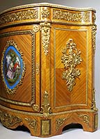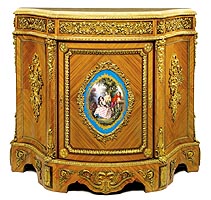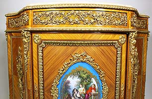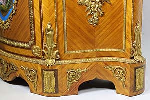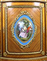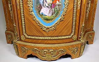 A Very Fine French 19th Century Louis XVI Style Ormolu Mounted and Sèvres Style Porcelain Mounted Tulipwood, Kingwood and Mahogany Meuble d'Appui (Wall cabinet) with an Onyx Marble Top. The serpentine single-door body surmounted with finely chased gilt-bronze mounts depicting grape-vines, floral wreaths, ribbon floral bouquets and leaf trim, the door centered with an ovoid shaped porcelain plaque depicting a courting scene of a seated lady, her chamber-maid standing behind her and a young man in a park setting. Circa: 1870-1880.