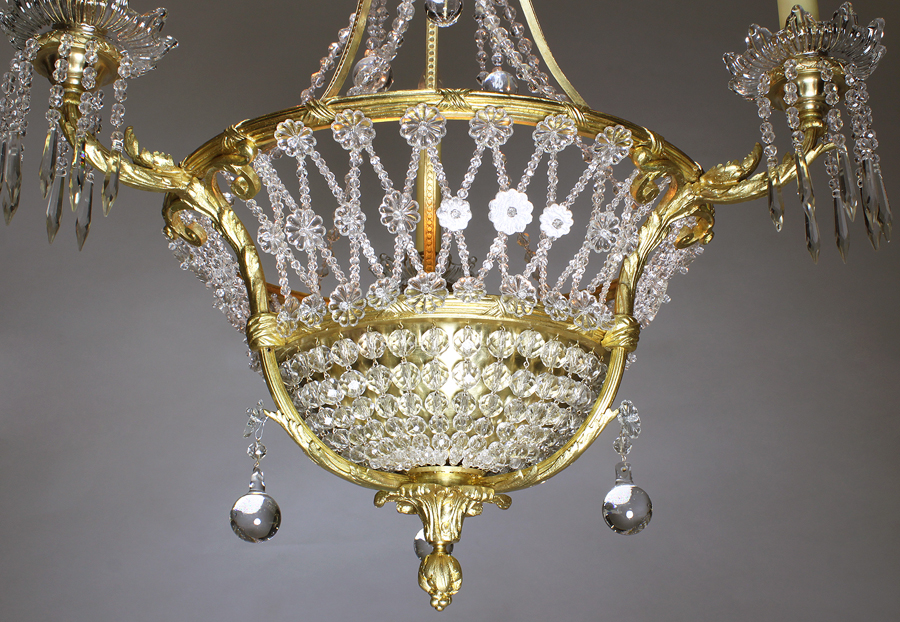 A Fine French Belle Époque 19th/20th Century Three-Light Light Gilt-bronze and Cut-Glass Basket Chandelier. The circular basket shaped banded gilt-bronze frame surmounted with three scrolled candle-arms and two interior lights, all decorated with weaved beaded cut-glass prisms, strands and spheres. Circa: Paris, 1900.