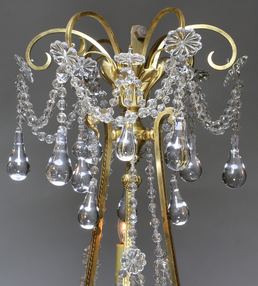 A Fine French Belle Époque 19th/20th Century Three-Light Light Gilt-bronze and Cut-Glass Basket Chandelier. The circular basket shaped banded gilt-bronze frame surmounted with three scrolled candle-arms and two interior lights, all decorated with weaved beaded cut-glass prisms, strands and spheres. Circa: Paris, 1900.