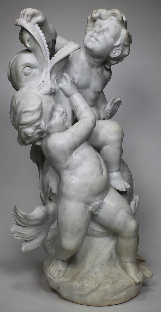 A Fine and Charming French 19th/20th Century Carved White Marble Whimsical Group Sculpture depicting Two Putti Playing with a Dolphin, fitted for use as a fountain. Circa: Paris, 1900.