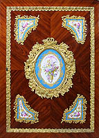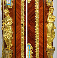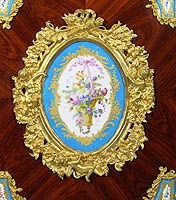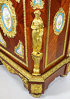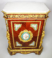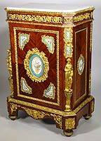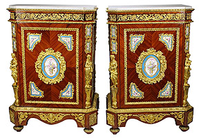 A Very Fine Pair of French Napoleon III Figural Ormolu and Porcelain (Probably Sevres) Mounted Tulipwood Meuble A Hauteur D'Appui. The rectangular shaped body fitted with a white marble top on canted corners. The reticulated frieze of scrolling grapevine and clusters interspersed with doves and centering paired squirrels. The front hinged door trimmed in acanthus cast encadrements enclosing central bleu celeste oval porcelain plaque of a ribbon-tied floral basket within a border of parcel gilt blossoming foliage and framed by cherubic enfants frolicking amongst flowering branches. On each corner, similarly decorated plaques flanked by Bacchanalian corner figures on a serpentine plinth mounted with a lion mask issuing scrolling fruiting foliage centered by square block panels with marguerite detailed mounts. Raised on circular bun feet trimmed with berried laurel collars. An old affixed label by a retailer/antique dealer in Scotland reads "From JAMES A. BUTTI - Fine Art Collector and Dealer in Articles of Virtue, 7 QUEEN STREET, EDINBURGH". Circa: Paris, 1860.