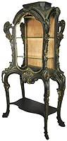 A Whimsical and Rare French 19th-20th Century Art Nouveau green and parcel giltwood carved single door vitrine cabinet. The highly stylized body with a front glass door and two side glass panels all flowing with curvilinear forms of organic, floral and plant-inspired motifs and raised on four elongated curved cabriolet legs with curved feet, circa: Paris, 1900.