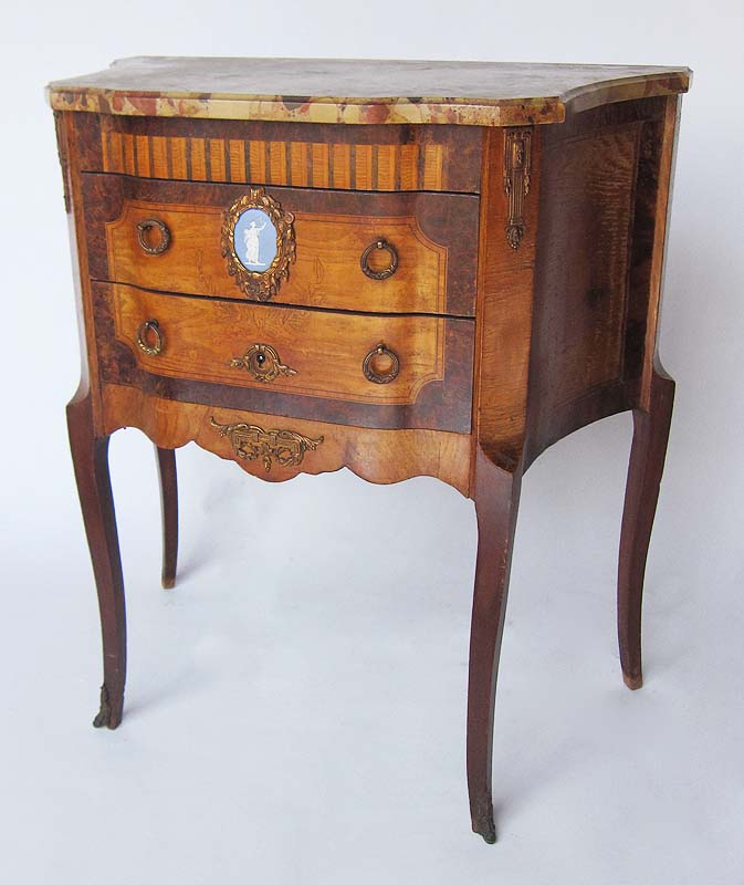 A French 19th/20th Century Louis XV Style Mahogany and Satinwood Marquetry and Parquetry Mini-Commode with gilt-bronze Mounts and centered with an Allegorical and Classical Wedgewood Plaque. Circa: Paris, 1900.