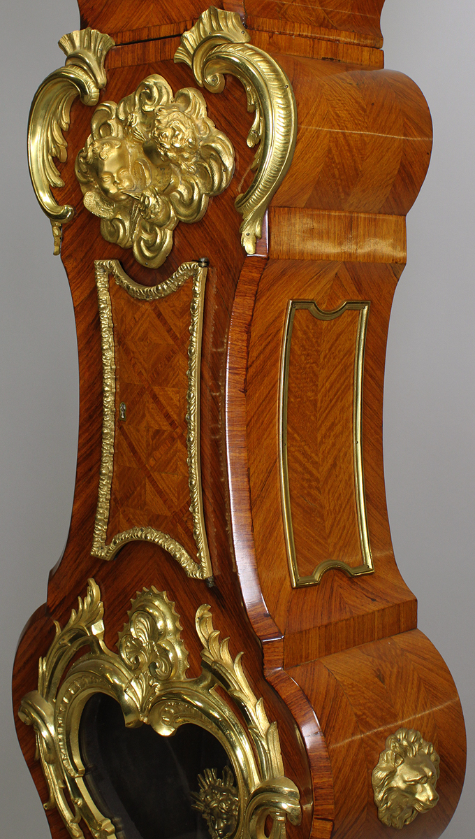 A Fine French 19th/20th Century Régence Style Gilt-Bronze Mounted Tulipwood Parquetry Regulator Longcase Clock, after the 18th century model by Julien Le Roy (French, 1686-1759) and Charles Cressent (French, 1685-1768). The asymmetrical cartouche-form bonnet surmounted by a gilt bronze allegorical figure of Father Time holding a scythe, the gilt-bronze dial with enameled Roman numerals, the parquetry inlaid case displaying zephyr masks, the heart-shaped pendulum reveal upon a bronze-mounted and parquetry paneled pedestal, the paw feet resting on a serpentine plinth. Circa: Paris, 1900.