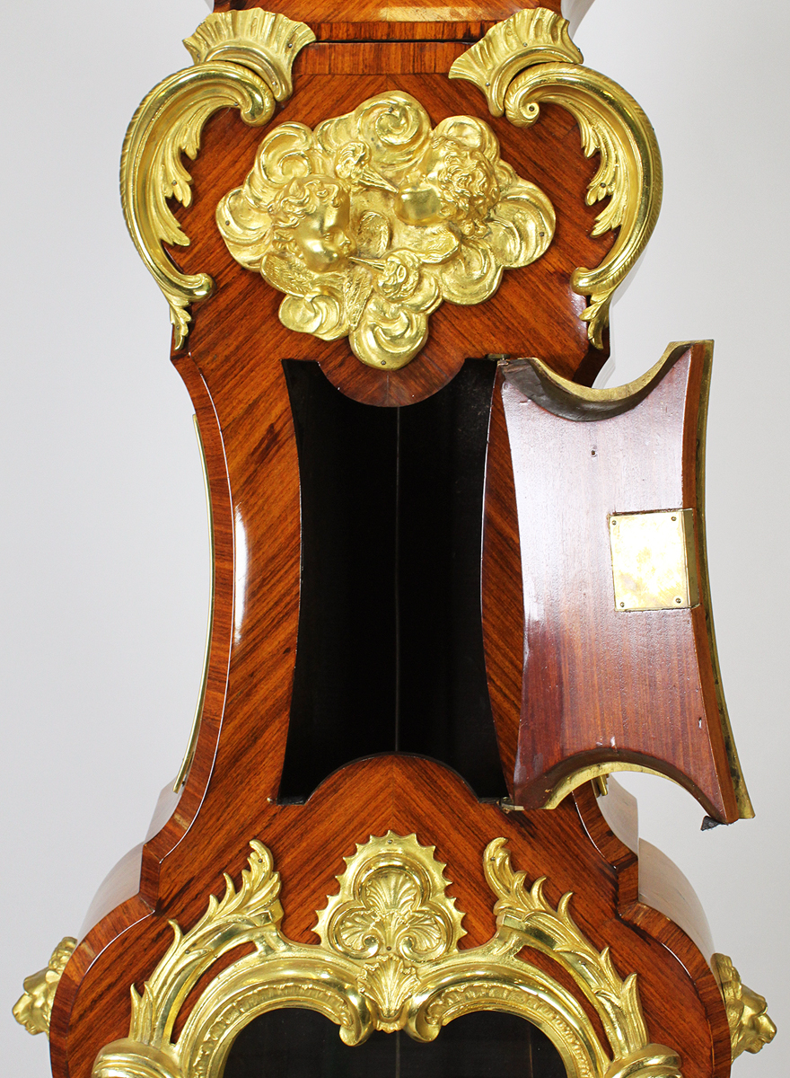 A Fine French 19th/20th Century Régence Style Gilt-Bronze Mounted Tulipwood Parquetry Regulator Longcase Clock, after the 18th century model by Julien Le Roy (French, 1686-1759) and Charles Cressent (French, 1685-1768). The asymmetrical cartouche-form bonnet surmounted by a gilt bronze allegorical figure of Father Time holding a scythe, the gilt-bronze dial with enameled Roman numerals, the parquetry inlaid case displaying zephyr masks, the heart-shaped pendulum reveal upon a bronze-mounted and parquetry paneled pedestal, the paw feet resting on a serpentine plinth. Circa: Paris, 1900.