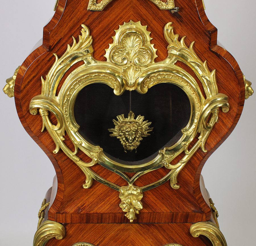 A Fine French 19th/20th Century Régence Style Gilt-Bronze Mounted Tulipwood Parquetry Regulator Longcase Clock, after the 18th century model by Julien Le Roy (French, 1686-1759) and Charles Cressent (French, 1685-1768). The asymmetrical cartouche-form bonnet surmounted by a gilt bronze allegorical figure of Father Time holding a scythe, the gilt-bronze dial with enameled Roman numerals, the parquetry inlaid case displaying zephyr masks, the heart-shaped pendulum reveal upon a bronze-mounted and parquetry paneled pedestal, the paw feet resting on a serpentine plinth. Circa: Paris, 1900.