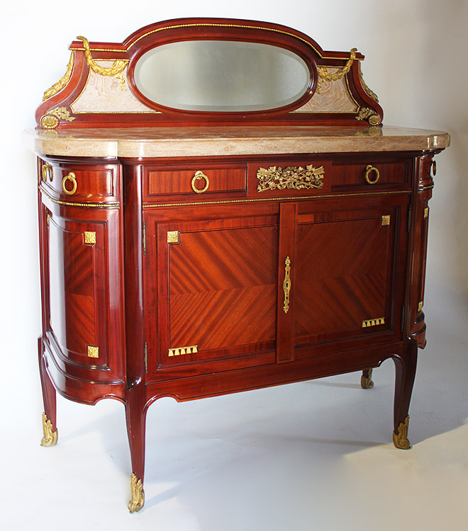 A Very Fine French 19th/20th Century Louis XV Style Mahogany & Gilt-Bronze Mounted Sixteen Piece Dining Set, comprising an oval table with three extensions and center support pedestal, twelve armchairs, a buffet, a server and a vitrine. Both server and buffet with marble top and framed marble and mirror backings. Circa: Paris, 1900.