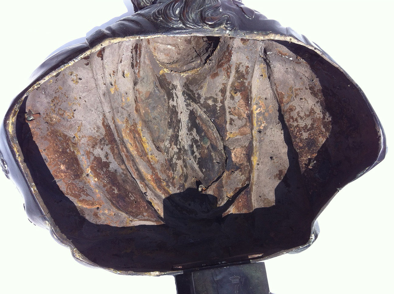 Attributed to Baron François-Joseph Bosio (French, 1768-1845) A Very Fine French 18th/19th Century Patinated Bronze Bust of Louis XVIII, the gazing slightly to sinister profile, wearing a coat, cravat and a cloak decorated with fleurs-de-lis and medals is one of several versions of Bosio's depiction of Louis XVIII, mos of which are currently exhibited in several French Museums and private collections. Royal Seal with Crown and Scrolls. Circa: 1800.