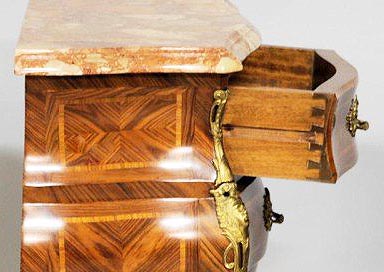 A Pair of French Louis XV Style Gilt-Bronze Mounted Kingwood Three-Drawer Mini-Commodes with Marble Top.