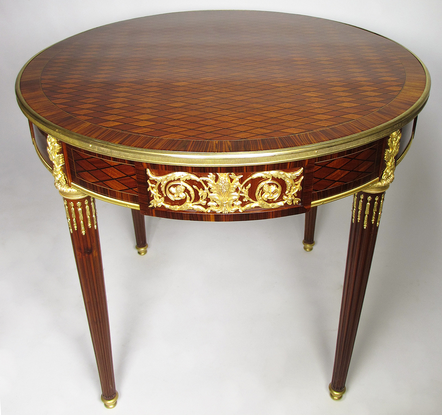 A Very Fine French Belle Epoque 19th/20th Century Louis XVI Style Tulipwood Parquetry and Ormolu Mounted Guéridon (Round Table) with a drawer. Circa: Paris, 1900.