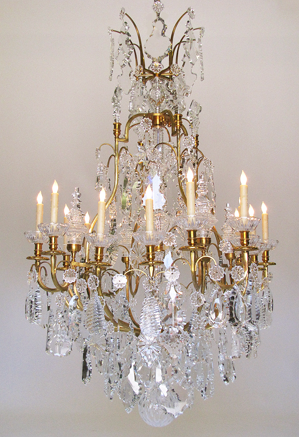 A Louis XV Style Gilt-Bronze and Lead Crystal Sixteen-Light Chandelier, the solid bronze frames with towers, wax-holders, fleur de liz' and a central support, attributed to Baccarat. Circa: 20th Century.