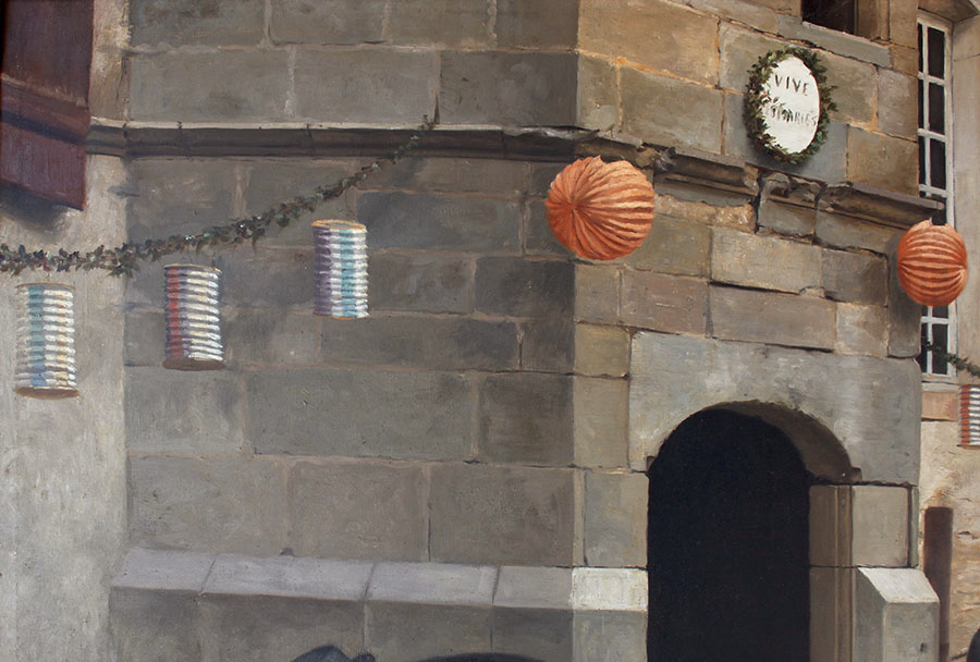 Georges-Marie-Julien Girardot (French, b. Besançon 1856 - d. Paris, 1914) "Avant le Mariage" (Before the Wedding) A Large and Impressive French 19th Century Oil on Canvas depicting a joyous patio scene preparing for a wedding celebration, a young maiden defeathering a goose, another setting the plates at the table which is centered with the wedding cake, and older maind cooking in the background while another receiving the delivery of food from a local merchant, two gentlemen retrieving the wine from the basement cellar. From the artist: "La scène est representée dans la cour de la maison Granvelle â Pesmes" (The scene takes place in the courtyard of the Maison Granville in Pesmes, France). Signed and dated (lower left) "GEORGES-GIRARDOT / 1889". Circa: Paris, 1889.