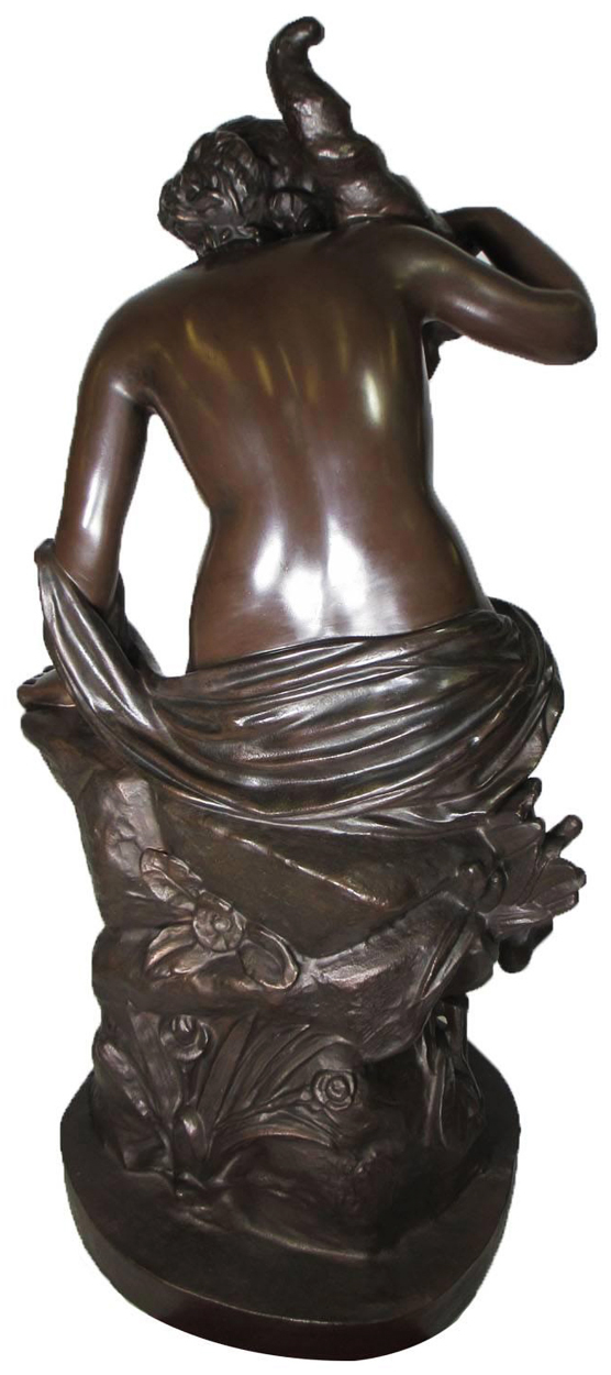 A Fine and Large French 19th Century Cast-Iron Fountain Figure Modeled as a Nude Maiden Seated on a Rocky Outcrop Holding a Cornucopia in Her Raised Right Hand, by J.J Ducel. Cast-Signed "J.J. DUCEL Me de FORGES, PARIS". Circa: Paris, 1880.